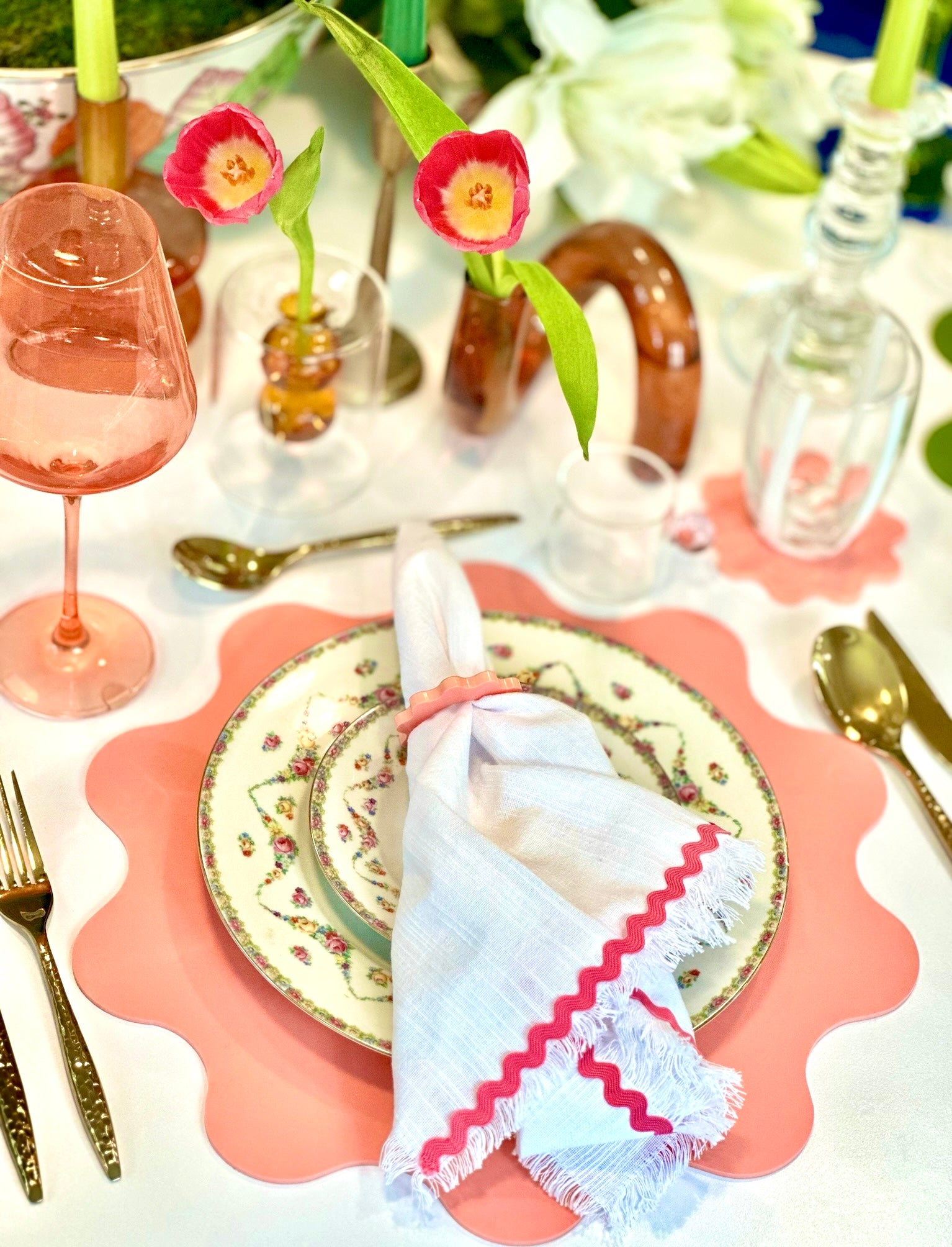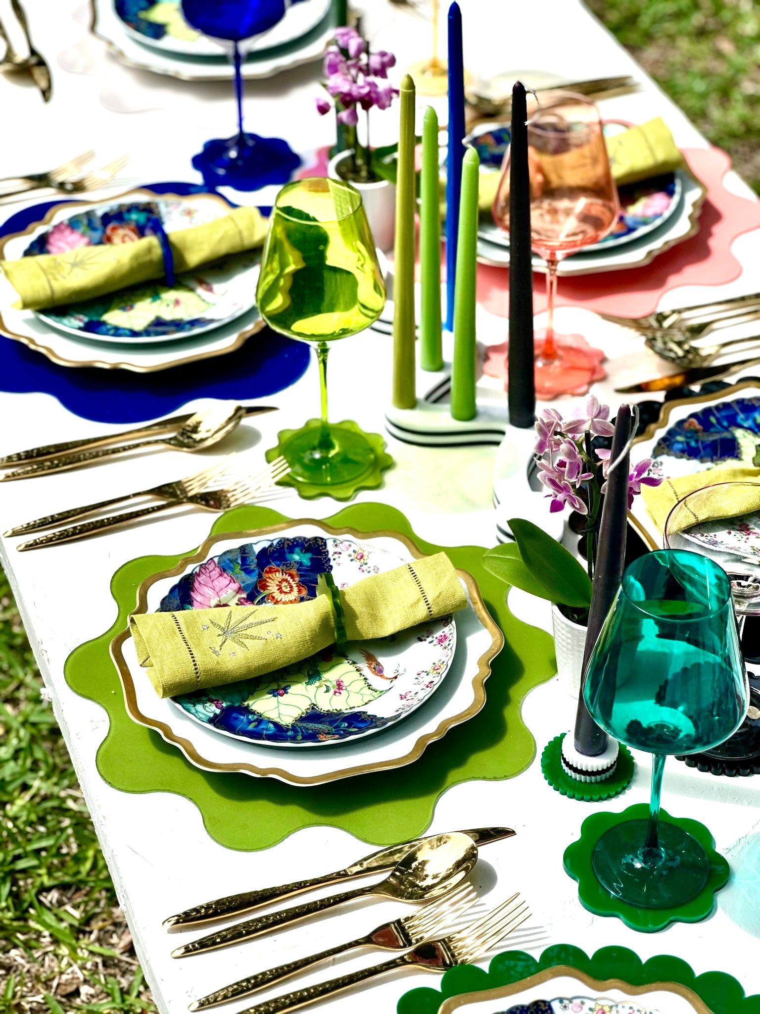 Our EXTRA WAVY trio bundle is for the wild + free - those who know what they like + celebrate their uniqueness. With its whimsy shape + fun color possibilities, it brings just the right amount of funk to any decor. The bundle includes (1) charger, (1) coaster and (1) napkin ring, all in the same shape + color. They are a great bang-for-your-buck option and add a playful touch to any discerning table. Small kiddos? Rowdy pets? No problem! Our acrylic is up to 17 times more durable than glass and can be easily wiped down + reused. These pieces are weather and UV-resistant, so enjoy them inside or al fresco for many years to come.