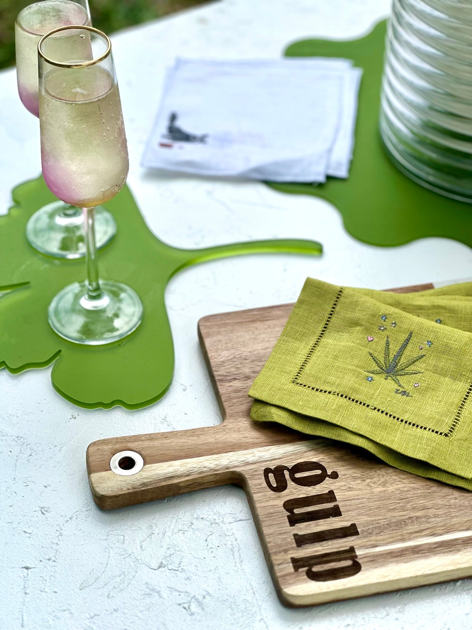 The Ginkgo Leaf is a symbol of resilience + longevity. It is thought to bring peace, healing, and hope to those who wear or use it. Our Ginkgo platters + candlestick holder will add a special touch to your home and serve as a reminder to slow down, breathe + love in the moment. Use the Single Ginkgo Platter as a serving platter, display your favorite candle and vase duo as a tray, add a unique touch to any table, or all of the above! Did we mention that acrylic is up to 17 times more durable than glass and can be easily wiped down + reused? It's lightweight and weather + UV-resistant too, so enjoy your pieces inside or al fresco for many years to come.