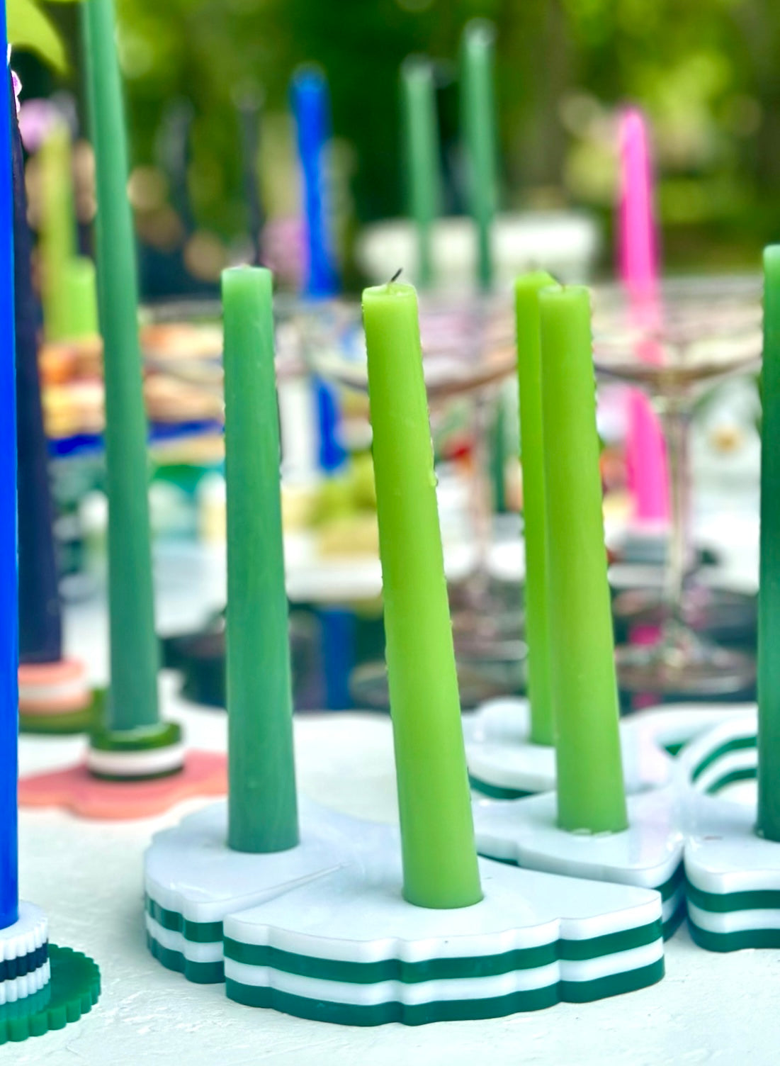Our SCALLOPED candlestick holder is for the posh - the sophisticated yet fun ones who air a bit on the preppy side. Its iconic shape + fun color possibilities bring a touch of class to any decor. Did we mention that acrylic is up to 17 times more durable than glass and can be easily wiped down + reused? It's lightweight and weather + UV-resistant too, so enjoy your pieces inside or al fresco for many years to come.