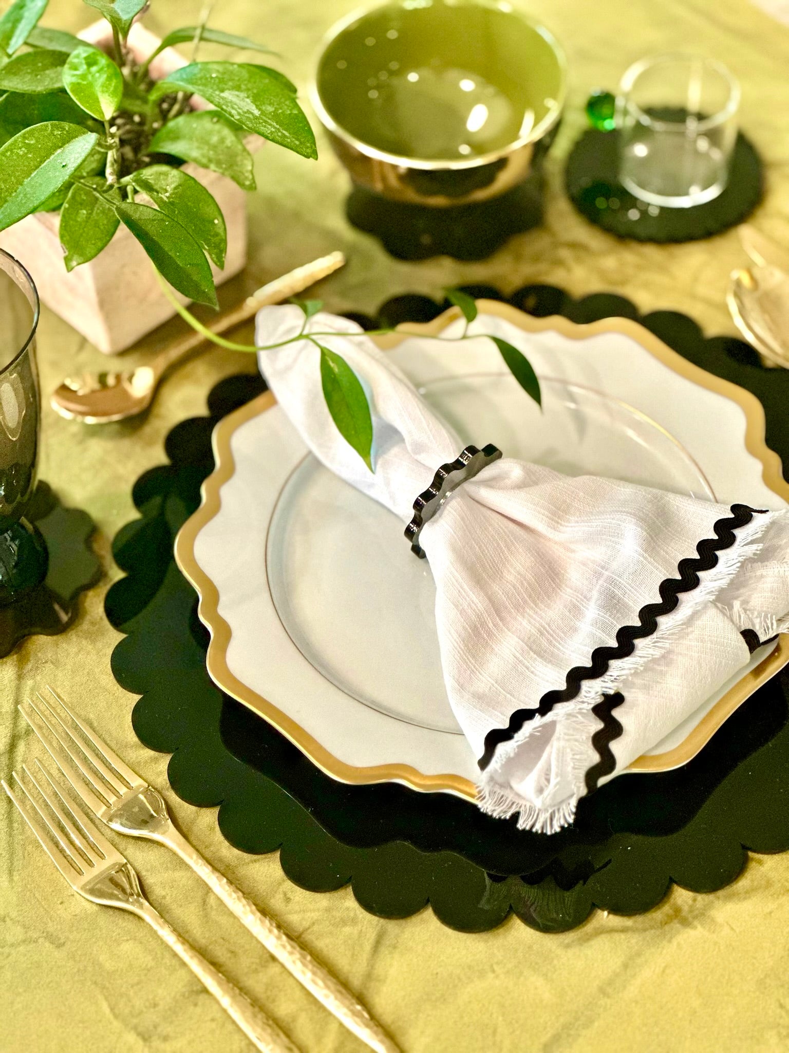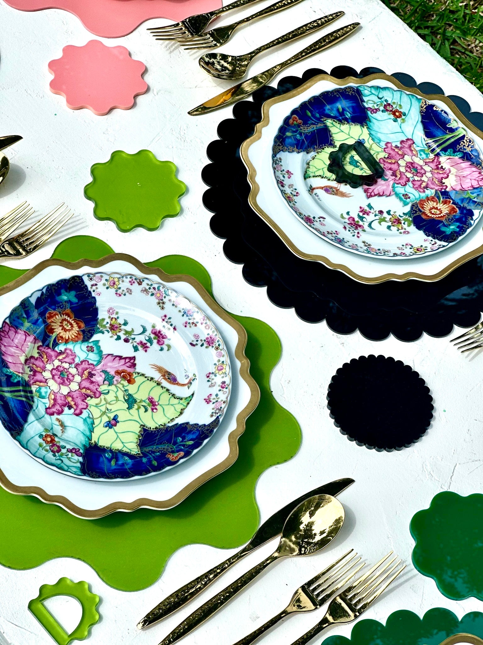 Our SCALLOPED charger is for the posh - the sophisticated yet fun ones who air a bit on the preppy side. Its iconic shape + fun color possibilities bring a touch of class to any decor. Its oversized scale makes a statement under any and all plates, from vintage china to casual melamine, and doubles as a unique tray for your bar, ottoman, or vanity. Grab one, a set, a trio bundle or mix-and-match with other shapes + colors to curate your own look. Did we mention that acrylic is up to 17 times more durable than glass and can be easily wiped down + reused? It's lightweight and weather + UV-resistant too, so enjoy your pieces inside or al fresco for many years to come.