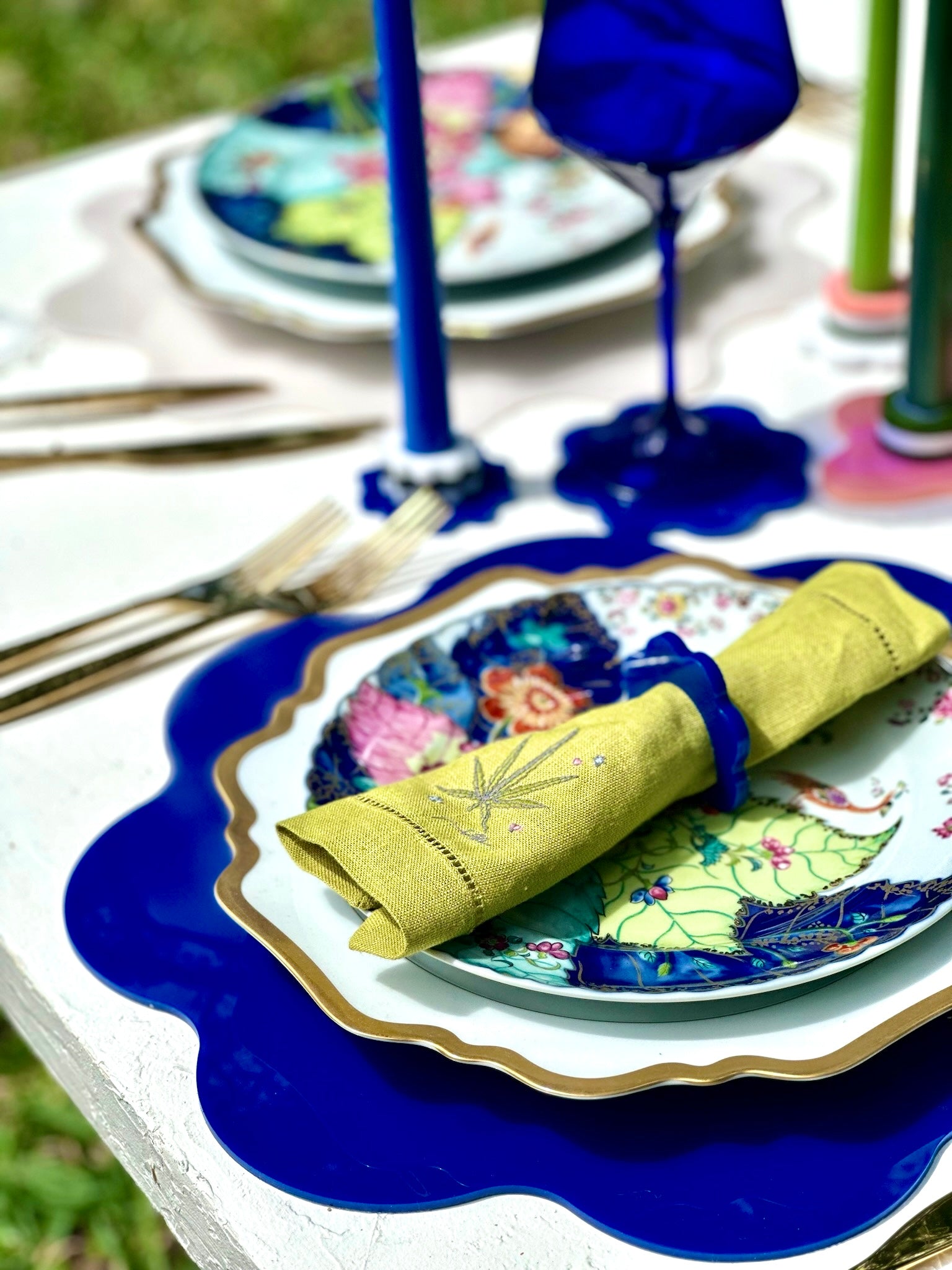 Our WAVY candlestick holder is for the flower-child at heart - the pleasant, easy-going one who lives + lets live. Its floral-like shape + fun color possibilities bring a touch of softness that will compliment any decor. The bundle includes (1) charger, (1) coaster and (1) napkin ring, all in the same shape + color. They are a great bang-for-your-buck option and add a playful touch to any discerning table. Small kiddos? Rowdy pets? No problem! Our acrylic is up to 17 times more durable than glass and can be easily wiped down + reused. These pieces are weather and UV-resistant, so enjoy them inside or al fresco for many years to come.