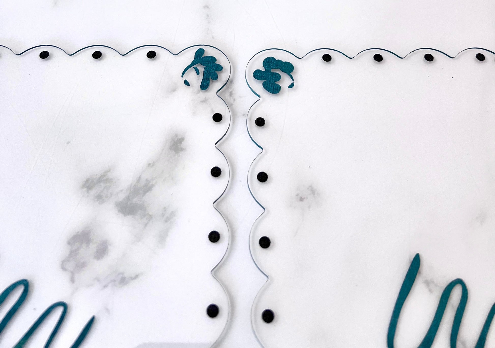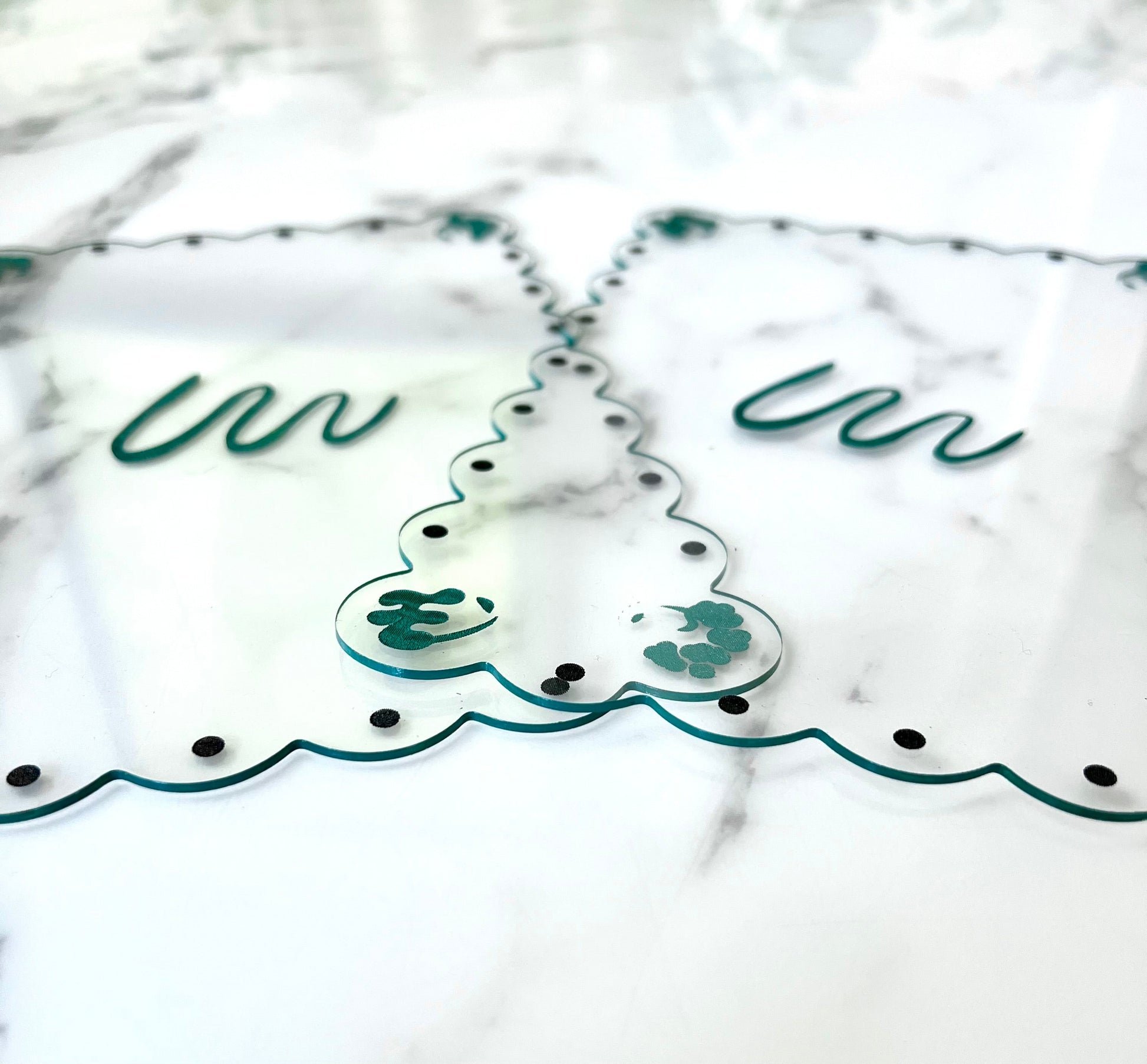 (2) 5.25"W x 7.75"H x 1/16"D CLEAR ACRYLIC MAHJONG SHUFFLERS, AVAILABLE IN YOUR CHOICE OF (3) SHAPES: WAVY, EXTRA WAVY OR SCALLOPED (SEE IMAGES FOR REFERENCE). EACH IS ENGRAVED WITH THE DESIGN + PAINTED PER ORDER. EDGING PAINTED UPON REQUEST.